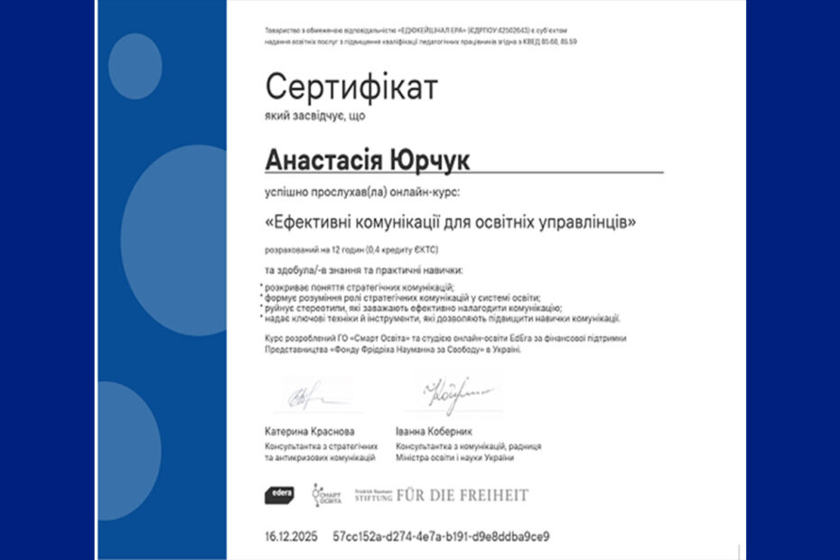 Хмельницький обласний інститут післядипломної педагогічної освіти імені Анатолія Назаренка 20–21 грудня 2025 року організував і… Читати далі »Співпраця з Хмельницьким обласним інститутом післядипломної педагогічної освіти імені Анатолія Назаренка