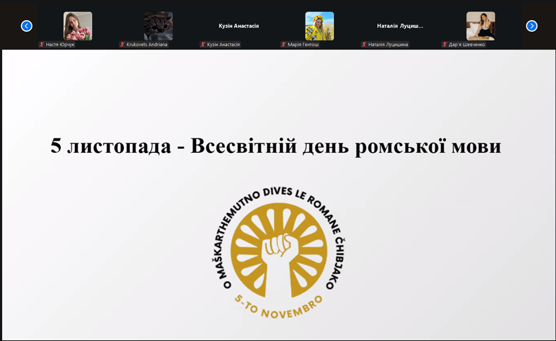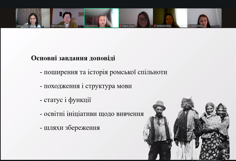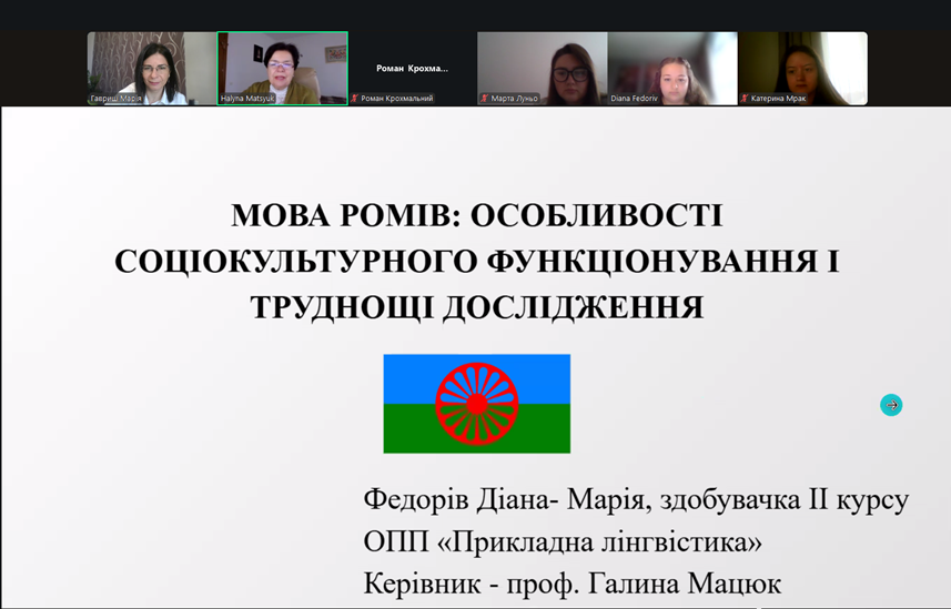 Семінар був присвячений напряму «національні мови: функціонування, вивчення і збереження». Федорів Діана, магістрантка ІІ курсу ОПП «Прикладна лінгвістика», виголосила доповідь «Мова ромів: особливості соціокультурного функціонування і труднощі дослідження» (керівник проф. Галина Мацюк), присвячену Міжнародному дню ромської мови, який відзначається 5 листопада. Доповідачка розкрила систему і структуру, діалектну варіативність, особливості функціонування ромської мови, пояснила напрямки її вивчення.